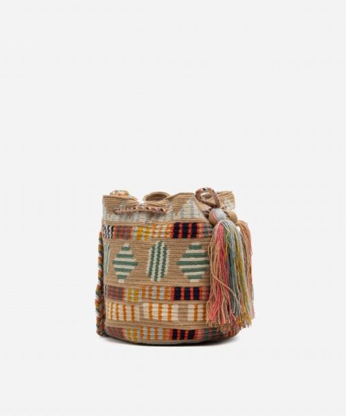 Guanabana’s design team brings this exclusive day-to-day bag in Madrid as a smaller version of the traditional hand-crocheted Colombian Wayuu mochila. Its fashionable patterns, colours, geometrical shapes, and log-braided handle make this bag a functional product you can wear to match your adventures. Check its bottom and indulge yourself with different decorations in each bag. The bag closes with colorful pompoms and their distinctive bronze tag with Guanabana’s leitmotiv: BE POSITIVE.