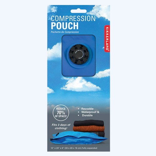 Struggling to fit everything you need for your trip into a carry-on? This compression pouch from Kikkerland is here to save the day! Ideal for packing your clothes into a small case, this pouch compresses your clothes by squeezing the air out. To use, simply place clothing inside and close. Open air duct and roll bag to press out air. Lock airduct to seal. Extra strong and waterproof—great for outdoors. Reduces 70% of space! Details