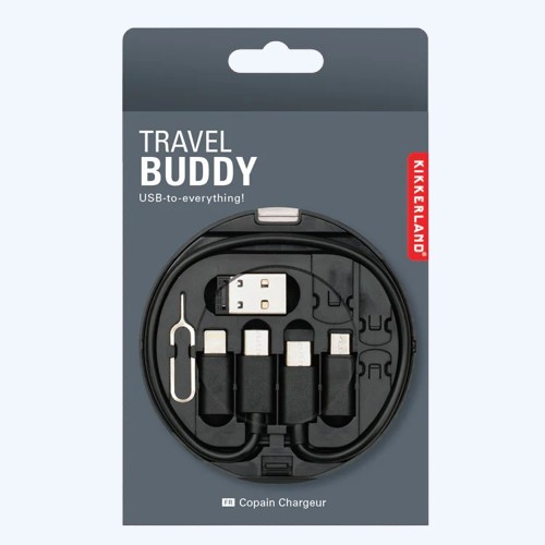 Charge all your devices on the go! This Travel Buddy Kit from Kikklerland includes USB to Lightning, USB to micro-USB, USB to type C, type C to micro-USB, type C to type C, type C to Lightning, SIM card removal pin, micro SIM card storage/Micro SD, and 2 slots for nano SIM cards. All of that and a phone stand, all within a handy travel case. Compatible with all smartphones. Details