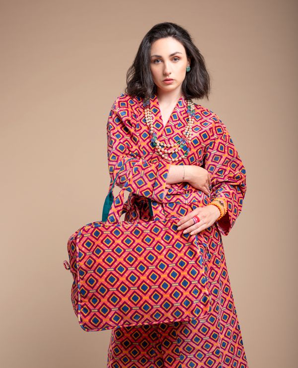 Les Touristes have designed this luxurious velvet bag for all those weekends away. The perfect size to fit everything you would need, this weekend bag is practical and stylish. Finished with a beautifully bright geometric pattern in 100% cotton velvet, cotton lining and a zip along the top.