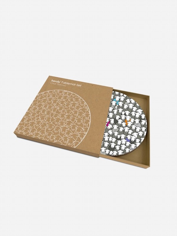 Gather your flock around the dining table! Herdy’s Flock tablemat set features a multi-coloured flock of cute Herdy faces and don’t forget to look out for Sheppy – he’s in there somewhere! The matt lacquer finish makes them easy to wipe clean and the cork back will protect your furniture from scratches and scrapes. Herdy’s Flock tablemat set comes in a presentation box, making it a perfect gift. Details Care