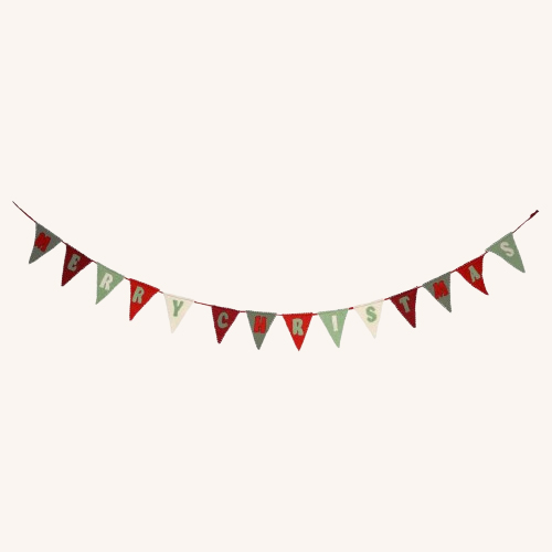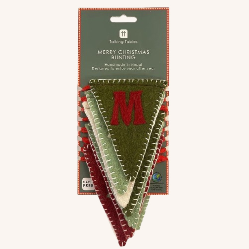 Spread holiday cheer with the Folklore Merry Christmas bunting from Talking Tables. Handcrafted in Nepal from 100% sheep’s wool, it’s adorned with 14 pennants that are all appliqued with a letter to spell out ‘Merry Christmas’. A wonderful keepsake you will enjoy hanging every year.