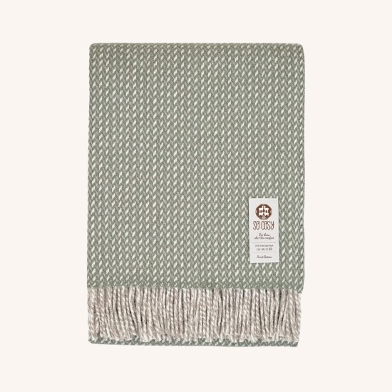 Wrap yourself in the unmatched warmth of So Cosy’s Dakota pure new wool throw blanket, featuring a modern herringbone pattern. The blanket combines sage green, cream, and beige, creating a soothing colour palette that complements any decor. Crafted with care, the Dakota throw blanket features a less brushed quality, ensuring no loose fibres like some other blankets. This attention to detail enhances both its durability and aesthetic appeal. This wool throw blanket is ideal for family gatherings or quiet afternoons. Whether it’s draped over your sofa or wrapped around you on chilly evenings, it stylishly delivers warmth and comfort. It also makes a perfect gift for anniversaries, weddings, or birthdays, combining practicality with elegance. Details Care Wool is naturally stain-resistant and water-repellent, but after a few minutes, the liquid will begin to soak into the fabric. To remove this liquid stain, use warm water and mild detergent to spot clean as soon as possible. Don’t scrub the fabric. Instead, soak the stained area with warm water and detergent and blot with a soft cloth. To wash heavily soiled wool blankets, it is important to follow the care instructions of the blanket. If the label says the blanket is machine washable, the most important steps to follow are to use the gentle wool wash cycle on the washing machine, use cold water and only use specified wool wash detergents. To dry wool blankets, it is best to hang them evenly over a clothes line or lay them flat to support the weight of the wet blanket. Keep the blanket away from direct sunlight to prevent fading and to avoid drying too quickly, which can make the fabric feel coarse. Avoid putting wool blankets in the dryer, as it can damage the softness and shape of the blanket.