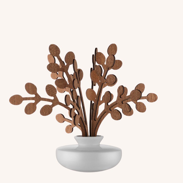 An Alessi fragrance diffuser with a twist on using classic reeds. This original design features mahogany wood leaves to diffuse the scent. The porcelain base is slightly rounded to help release the fragrance into the room.