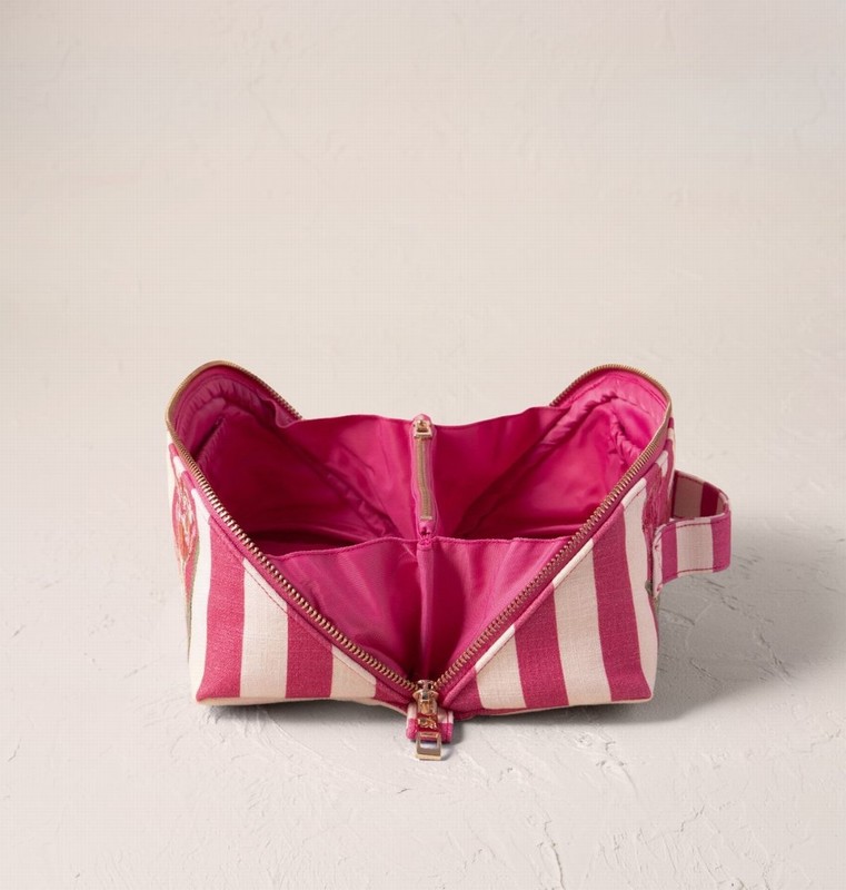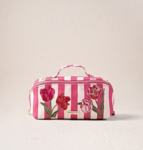 Fresh from the flower market, playful pink stripes and bright threads bring the beauty of spring tulips to life, perfect for gifting or carrying your makeup essentials in style.