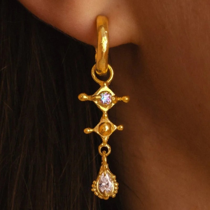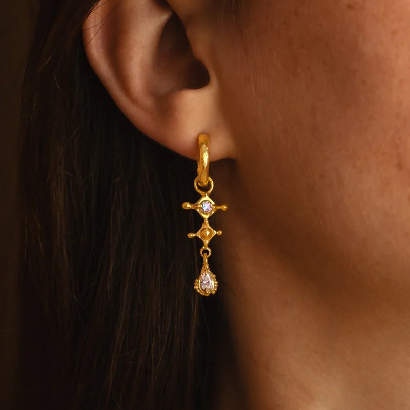 These charms are a way of carrying around little fragments of one of the key influences behind the collection – 90’s catwalk bohemian sparkle. Ruby Jack’s ‘The Aurora Hoops’ feature stunning drops of Aurora Borealis Crystal and Cubic Zirconia, beautifully catching the light. Finished with 24k Gold Plating, these earrings are a elegant touch to any look.