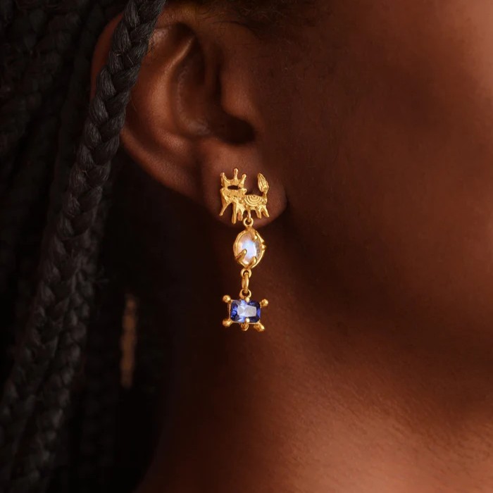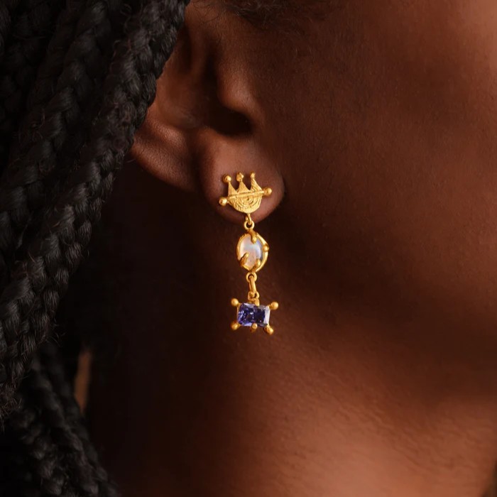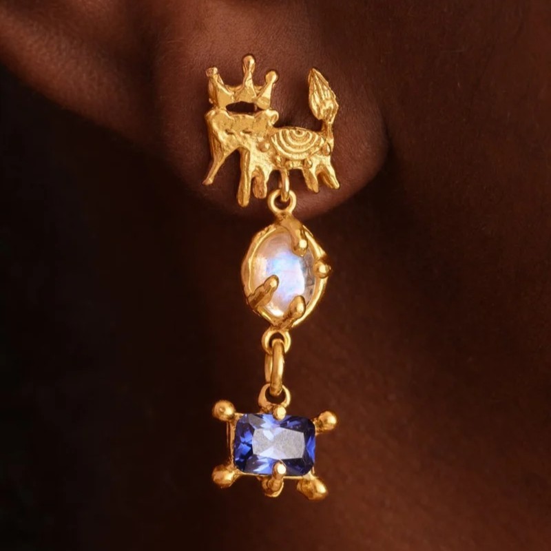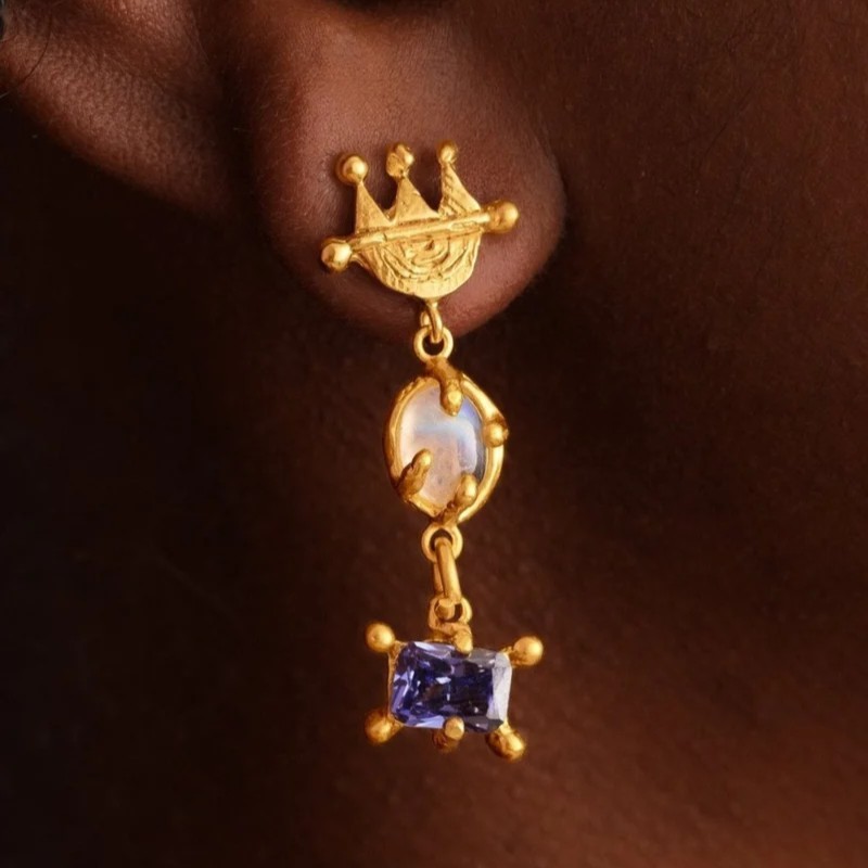 The Empire for Elephants earrings feature two different studs, an elephant and a jester. Both adorned with Moonstones and Tanzanite Blue Cubic Zirconia, these earrings are incredibly special and are certainly a talking point.
