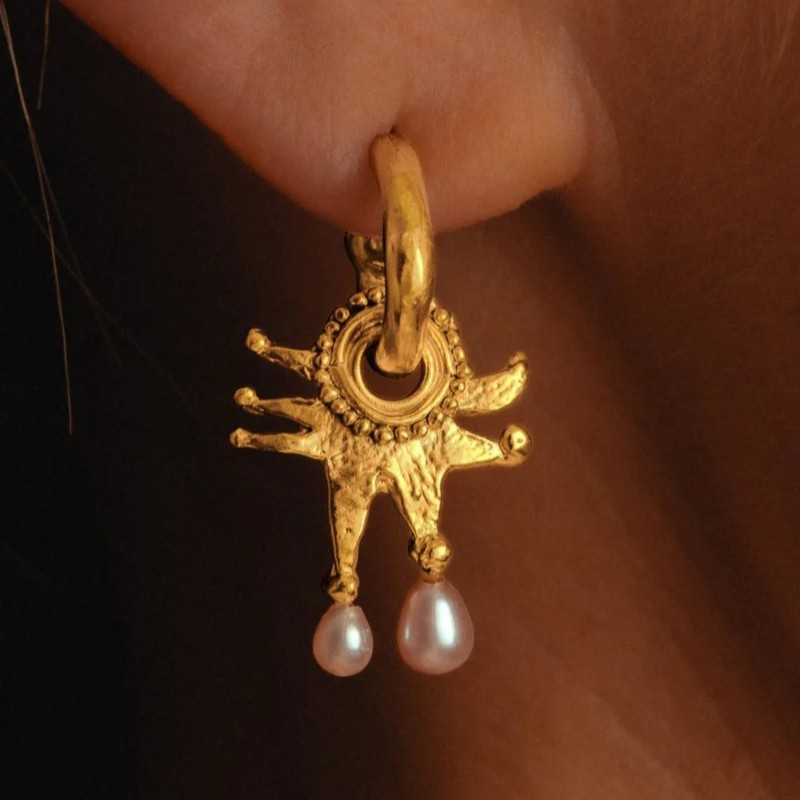 Inspired by antique clown costumes of the 1910s and 20’s, Ruby Jack has designed these quirky Pearly Moon Clown Costume Hoop earrings.